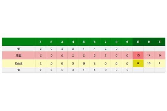 中日 13-8 DeNA(10日・横浜)