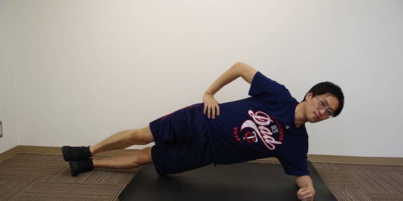 肘を置く場所は、肩からちょうど下に落ちたあたり。体幹、腹直筋だけでなく、骨盤部全体、腹横筋、腹斜筋、中臀筋まで効く。