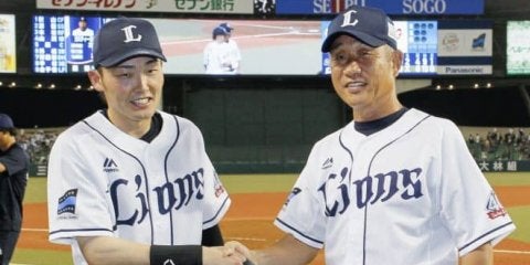 221試合連続フルイニング出場を達成し、辻監督(右)と握手する西武・源田=メットライフドーム【写真提供:共同通信社】 埼…