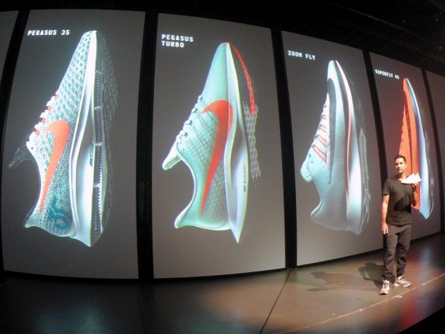 ▲ナイキの歴代の厚底ランニングシューズを紹介するナイキ ランニング フットウェアでヴァイス・プレジデントを務めるブレット・ホルツ氏