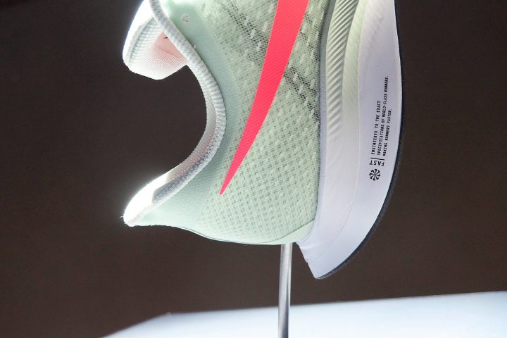 ナイキ ズーム ペガサス ターボは、透明なメッシュと鮮やかな赤のストライプが印象的な外観です。オフセット(シューズの踵とつま先の厚みの差)は10mmで、前足部分のソール(底)は12mm。ランナーがしっかりとエネルギーを保てるよう、踵の襟はアキレス腱から遠ざかるように設計されています。