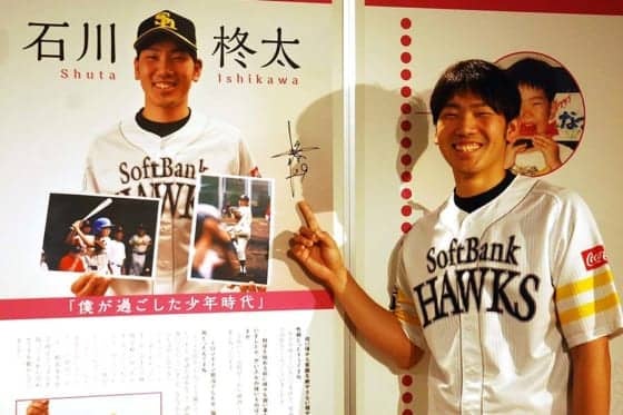 ヤフオクドーム内の王貞治ベースボールミュージアムで14日から特別企画展「鷹戦士たちの少年時代」がスタート。15日の全体練習前、石川柊太が同展を訪れた。