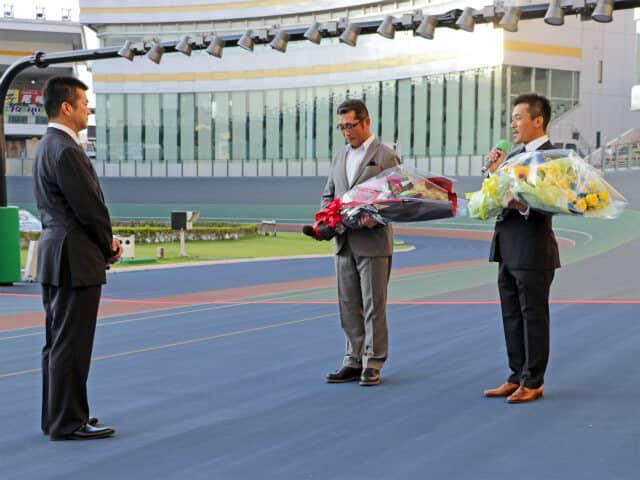 所縁のある滝澤正光(千葉43期・引退・日本競輪学校校長)と武井大介(千葉86期)から花束贈呈。