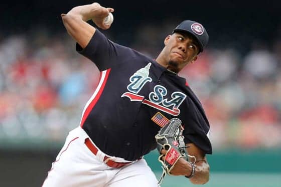 3回1死一塁の場面、チームUSAの3番手としてレッズの右腕ハンター・グリーン投手が登場。100マイル(約161キロ)超えのファストボールを連発すると、スタンドにはどよめきが走った。ホワイトソックスのバセベにソロ弾を浴びたものの、続くパドレスのタティスへの2球目にはこの日最速の103.1マイル(約165.9キロ)を記録。エンゼルスの大谷翔平投手のメジャー自己最速は101.1マイル(約162.7キロ)、日本での最速は165キロだが、18歳は大谷を凌ぐほどの火の玉ストレートを投げ込んだ。
