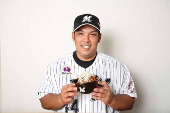ZOZOマリンスタジアムのフロア1外野ライトスタンド下にあるガナドールで販売される「豪快ヘルメットチャーシュー丼」は、大盛りご飯に自家製チャーシューを山盛りにした豪快な丼ぶり。井上は「このお店のチャーシューはとても美味しかったので、丼ぶりにすれば絶対に人気が出ると思い、プロデュースしました。ホームラン級の絶品メニューを豪快に食べて応援しマクってください」と宣伝した。(Full-Count編集部)