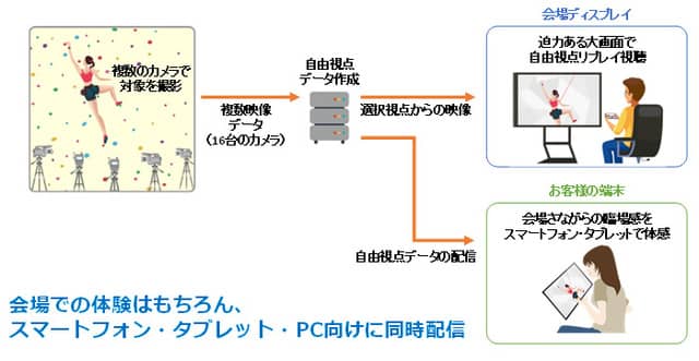 映像生成は、短い処理時間で自由視点映像を生成し、様々なカメラアングルで映像を鑑賞できる「タイムスライス自由視点」を基本とし、KDDI総合研究所が開発した注目選手へのフォーカスによる高精度な視点操作機能を活用。スマートフォンやタブレットから自由に視点を操作でき、選手が壁を登る様子を間近で見ているような臨場感を楽しめる。