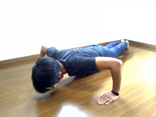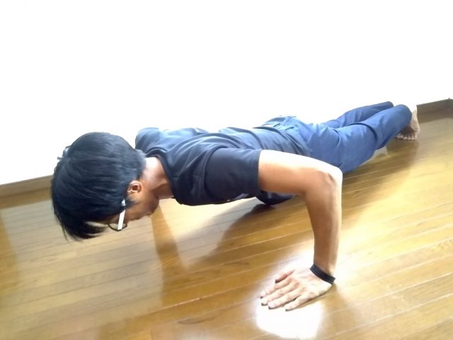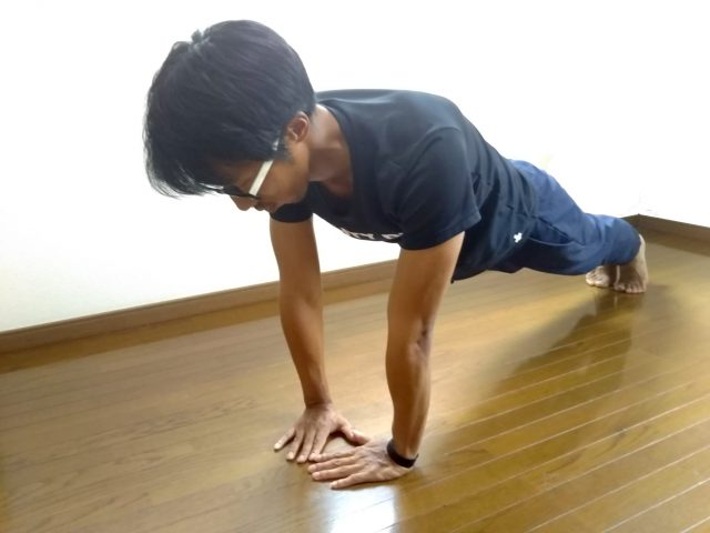 1.腕立て伏せの姿勢になります。この時、手幅は肩幅よりもこぶし2個分、外側に広げて床につきます。