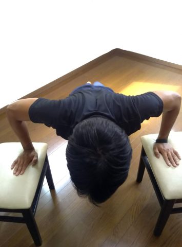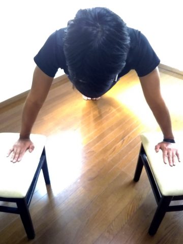 1.両手をテーブルやイスなどの上に乗せ、頭が足よりも高くなるようにして腕立て伏せの姿勢になります。