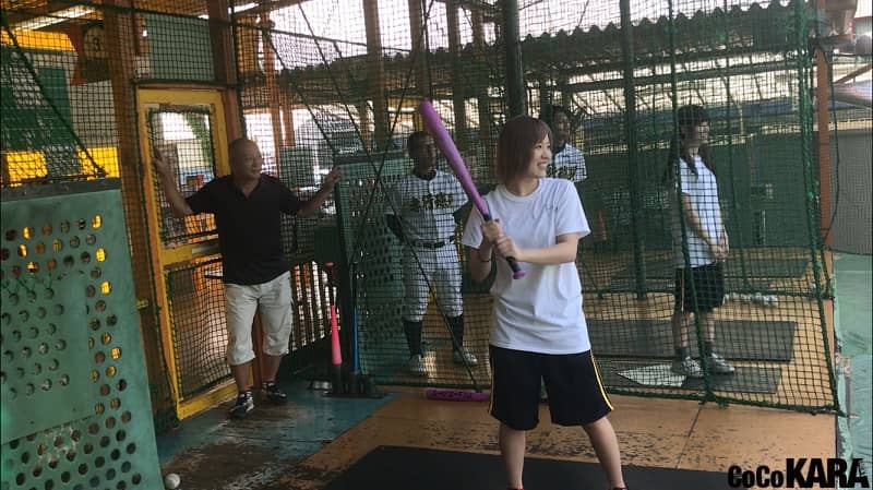 都内のバッティングセンターで行った撮影で、高木さんはまずは二人のバッティングを1打席ずつ見学。