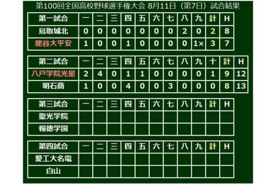 第100回全国高等学校野球選手権記念大会第7日、第2試合は八戸学院光星(青森)が初出場の明石商(西兵庫)を延長10回の熱戦の末に9-8で下し、初戦を突破した。