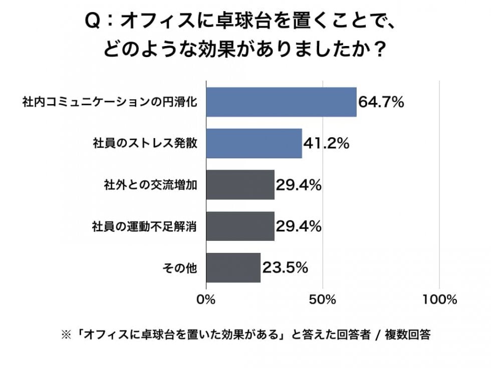 同社の調査によると都内で設立10年未満のベンチャー企業でオフィス内に卓球台が設置されているのは全体の約25%。卓球台未設置の企業のうち「オフィス内に卓球台が欲しい」と回答したのは80%と、企業のオフィス内への卓球台設置のニーズが確認された。また、卓球台設置済の企業のうち80%以上が「オフィスに卓球台を置いたことで期待していた効果があった」と回答し、社内コミュニケーション・交流の増加や社員のストレス発散にも役立っていることがわかった。