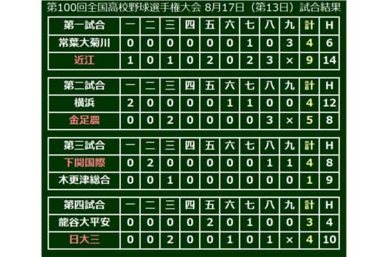 第100回全国高等学校野球選手権記念大会第13日は17日、3回戦残り4試合を行った。第1試合は、近江(滋賀)が9-4で常葉大菊川(静岡)を下して、準々決勝に進出した。