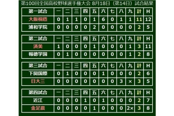 済美は報徳学園を振り切って4強入り、日大三は8回裏の3点で逆転勝利 第100回全国高等学校野球選手権記念大会第14日は1…
