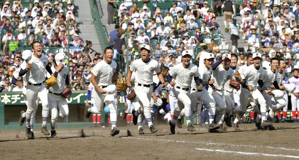 【写真提供=共同通信社】関国際-日大三 下関国際に逆転勝ちで準決勝進出を決め、応援席へ駆けだす日大三ナイン=甲子園
