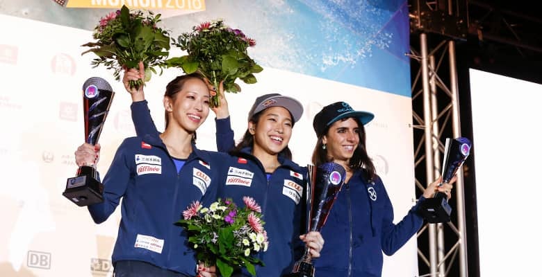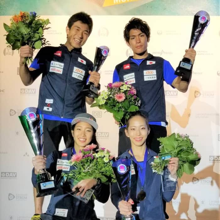 2018年のボルダリングW杯で年間表彰台に上がった4名の日本人選手たち(写真=JMSCA)