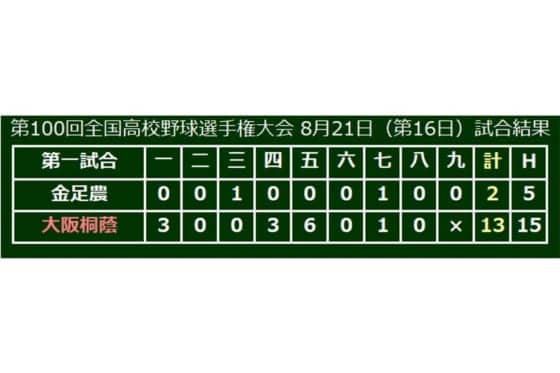 大阪桐蔭は、金足農の剛腕・吉田を攻め、初回に3点を先制。4回には宮崎の3ラン本塁打、5回にはプロ注目の5番・根尾の2ラン本塁打などで6点を加え、大量12得点。ここまで秋田大会、甲子園と全10試合に完投してきた吉田を132球で降板に追い込んだ。7回にも1点を加えると、先発のエース柿木が金足農の反撃を2点に抑えて2試合連続の完投勝利を飾った。