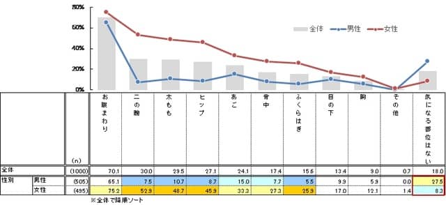 次に、自分の体で脂肪やたるみが気になる部位を尋ねたところ、「お腹まわり」男性65.1%、女性75.2%が最も多かった。腹筋が割れている同性・異性を魅力的と感じるかどうかを尋ねた結果では、女性は「腹筋の割れた異性に対して魅力を感じる(魅力的である+やや魅力的である)」と回答した人が72.5%を占めた。一方、男性の同回答は36.2%に留まっており、男女間で大きな違いがあった。