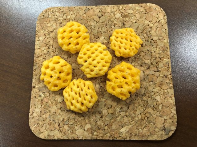 まずは昆虫をイメージした六角形のスナックから。少し固めのサクサクとした食感で、一口食べると次の手が止まりません。おいしい。なお、こちらのスナックにはコオロギ成分は含まれていません。