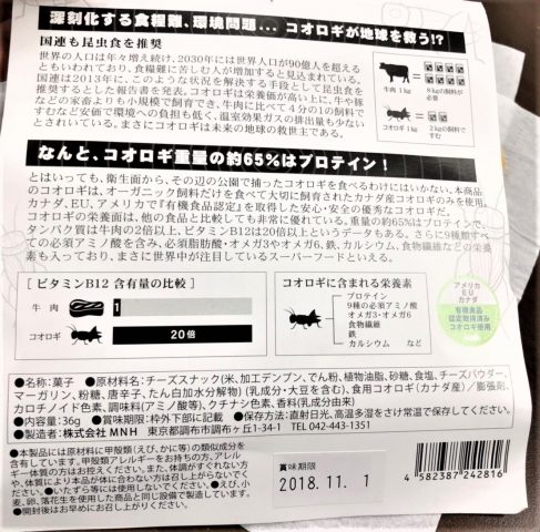 ・原材料名:チーズスナック(米、加工デンプン、でん粉、食物油脂、砂糖、食塩、チーズパウダー。マーガリン、粉糖、唐辛子、たん白加水分解物 ※乳成分・大豆を含む)、食用コオロギ(カナダ産)、膨張剤、カロチノイド色素、調味料(アミノ酸など)、クチナシ色素、香料(乳成分由来)