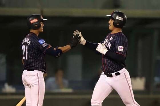 野尻幸輝(左)の2安打3打点の活躍などで侍ジャパンU-18代表はスリランカ代表に快勝【写真:荒川祐史】