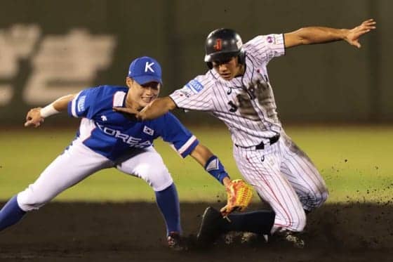 初回、吉田が韓国の4番キム・デハンに3ランを浴び、いきなり3点を失った侍ジャパンU-18代表。韓国の先発左腕キム・キフンの前に大苦戦を強いられていた打線は、6回に反撃。この回からマウンドに上がった2番手ウォン・テインをつかまえた。