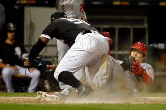 本塁で相手投手と交錯したエンゼルス・大谷翔平【写真:Getty Images】