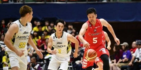 走るバスケットに田口の3ポイントシュートで突き放す