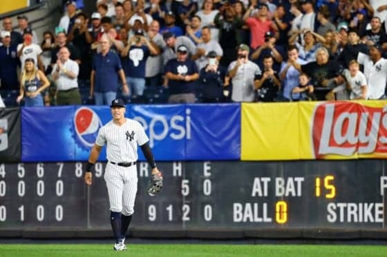 田中将大投手の6回無失点の快投で11-0の大勝を飾ったヤンキース。打線爆発でファンも大満足の一戦となったが、ヤンキースタジアムが大きな盛り上がりを見せたのは8回だった。ジャッジがダグアウトからライトの守備へと向かうと、客席からは大きな拍手が送られた。