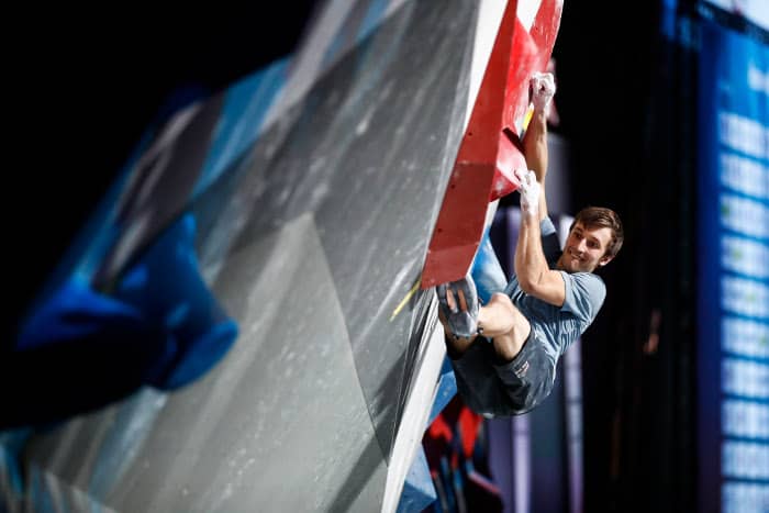 今シーズンのボルダリングW杯年間王者であるイェルネイ・クルーダー(スロベニア)や同2位の楢崎智亜が敗退するなど、ハイレベルな戦いとなった準決勝を日本勢から原田、渡部、藤井の3人が勝ち上がった。誰が優勝するかまったく予想のつかない最終ラウンドの第一課題。先頭のネーサン・フィリップス(イギリス)が、ダイナミックに横移動するコーディネーション系のムーブを決めてゾーンを獲得。5トライ目で完登するとあとの5人全員がそれに続き、一撃したチョンがアテンプト数で一歩リードした。
