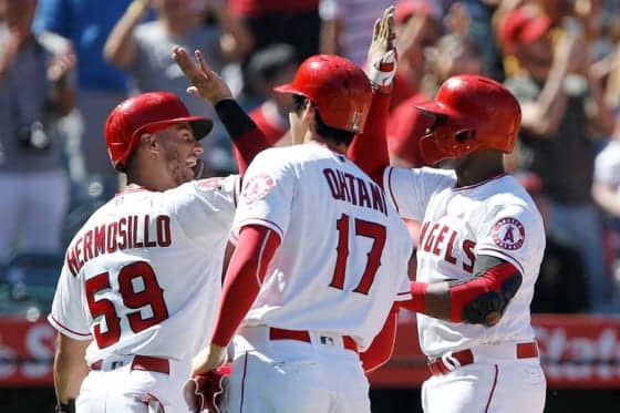 3回、アップトンの3ランで生還したエンゼルス・大谷翔平【写真:AP】