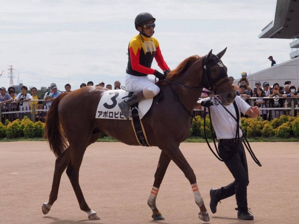 23日、中山競馬場で行われた4R2歳新馬(ダ1200メートル)は、5番人気のアポロキングダム産駒・アポロビビ(牡2、中舘)が勝ち上がった。