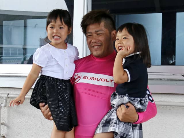 応援に駆け付けた愛娘の左・陽彩ちゃんと右・杏奈ちゃん(双子)を抱き上げた。