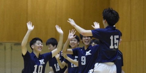 <写真・第2セットを獲得し、笑顔を見せる選手たち> 9月23日、立命館大学いばらきキャンパスにて2018年度関西大学…
