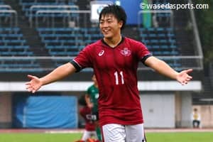 ついに待望の勝利をつかんだ! 関東大学リーグ戦(リーグ戦)の第14節が行われ、早大と同様、後期開幕から2戦勝ちなしの7位・専大と対戦した。公式戦3試合ぶりに先制点を挙げた早大だったが、前半のうちに同点とされ、我慢が続く展開となる。しかし後半、MF相馬勇紀(スポ4=三菱養和SCユース)の2得点でリードを奪い、その後の専大の反撃をGK小島亨介(スポ4=名古屋グランパスU18)のビッグセーブなどで1失点にとどめて勝利。台風が迫る中で行われた激闘を制し、後期初の勝ち点3を獲得した。