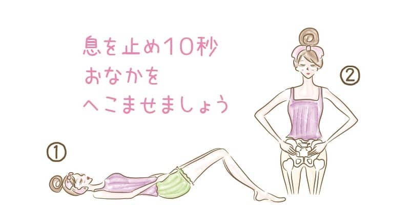 これが腹横筋が収縮した状態で、お腹はいつもよりもへこんでいます。そのまま10秒息をとめ、お腹をへこませておきましょう。