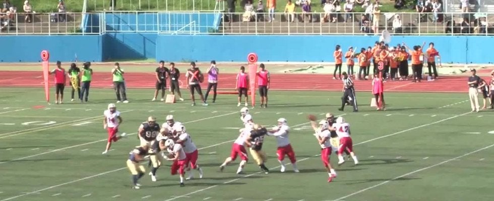 前節、オフェンスが振るわずTDなしの関大と、宿敵の京大を下し勢いに乗る神戸大。注目を集める一戦は神戸大の優勢かと思われた。先攻の神戸大はテンポよくオフェンスを進め、早速敵陣に入る。しかし、ここでファンブル。攻撃権を失う。そこから関西大は、前節から立ち直したオフェンスがランを進め、#82桑田へのロングパスで先制TDを奪う。
