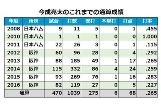 2005年の高校生ドラフト4位で日本ハムに入団した今成は2012年途中にトレードで阪神へ移籍。捕手だけでなく、内野、外野でもプレーし、2014年には115試合に出場。だが、これをピークに出場機会が減少し、昨季、今季と2年連続で1軍出場は無かった。