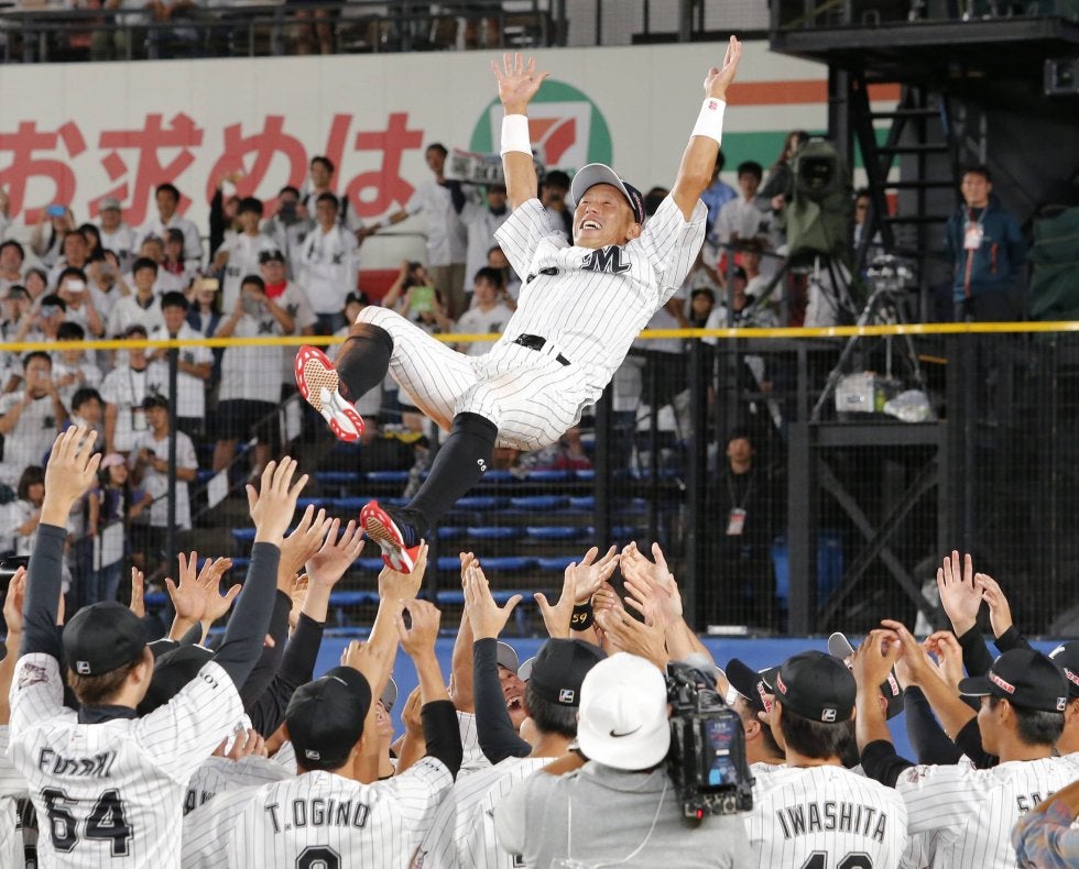 ロッテ―ソフトバンク25 引退セレモニーで胴上げされるロッテ・岡田=ZOZOマリン【写真提供:共同通信社】