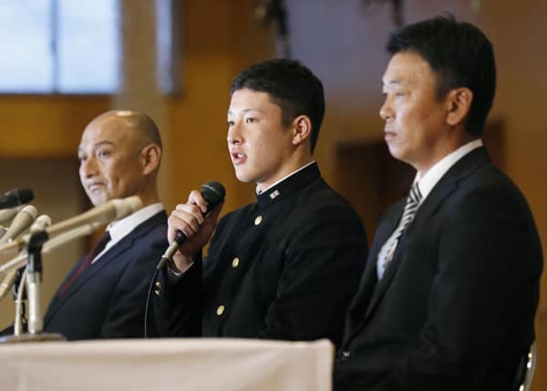 プロ志望届を提出し、記者会見する金足農・吉田輝星(写真中央)