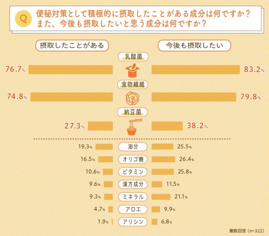 さらに、便秘対策で実際に摂取したことのある成分や、摂取したい成分について尋ねると、「乳酸菌」と「食物繊維」が上位2位を占める結果となりました。