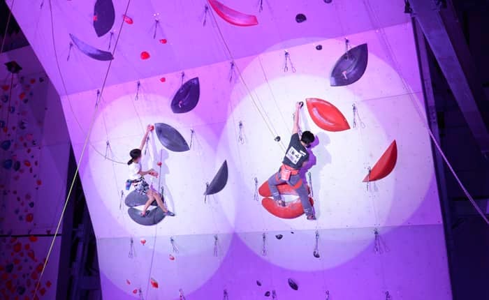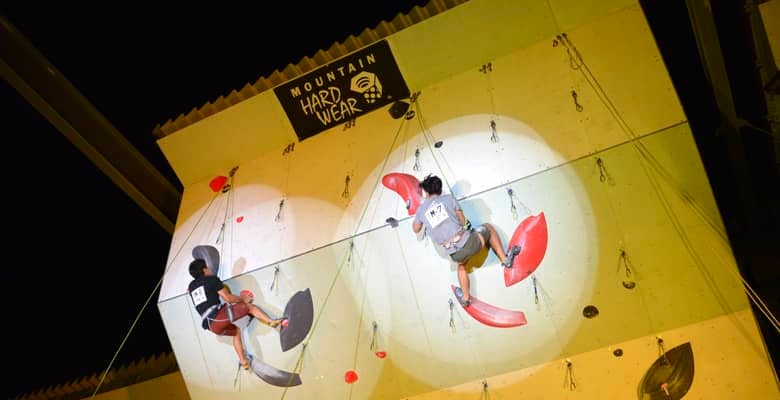 舞台となったのは兵庫県神戸市の複合商業施設「ミント神戸」屋上。地上80mの高さという抜群のロケーションで開かれた大会は、予め終了点にロープが支点確保されているトップロープ形式で実施され、ビギナー、ミドル、マスターの3クラスから構成。到達点とそのスピードを競う日本ではあまり目にしなかったフォーマットで、決勝トーナメントは同一ルートを隣り合わせで登るデュアル方式が採用された。
