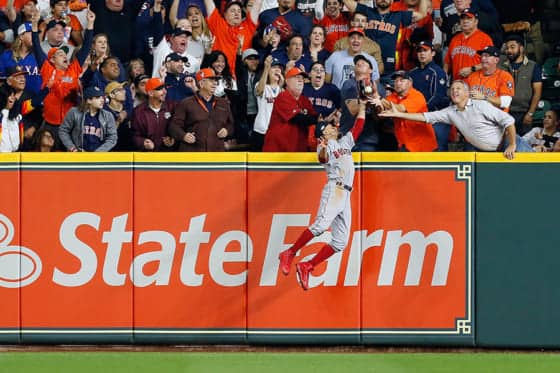 問題のシーンは初回にあった。初回に2点を先制されたアストロズは、1死からスプリンガーがヒットで出塁。そして、続くアルトゥーベが先発ポーセロからライトへの大飛球を放った。誰も触らなければフェンスオーバーという当たりを右翼手ベッツが追い、フェンス際で懸命にジャンプ。すると、スタンド最前列でボールを捕球しようとしたファンの手とグラブが接触した。