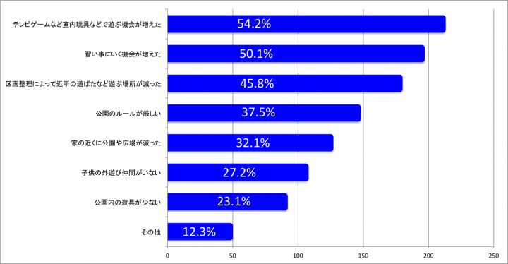 では、どうして子どもの外遊びは減ってしまった(と感じる)のでしょうか? 「子供の『外遊び』が減少したと感じる理由は何でしょうか?」という質問をしたところ、回答者の54.2%が「テレビゲームなど室内玩具などで遊ぶ機会が増えた」、次いで50.1%が「習いごとにいく機会が増えた」と答えました。なるほど、スマホなどの登場もありますが、都会の子どもは習いごとでけっこう多忙な子も多いようですね。