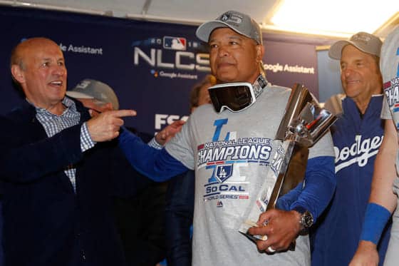 WS進出を祝うドジャースのデーブ・ロバーツ監督(中央)【写真:Getty Images】
