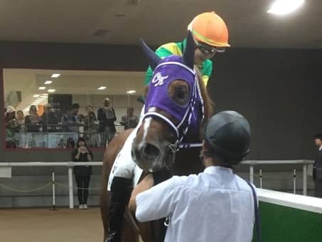 手綱をとった木幡育は「スタートダッシュが早く、3番手から砂を被らずリズムよく運べました。直線で追ってからの反応も良く、粘り強く頑張ってくれましたよ。ダートも合っていると思います」と白い歯を見せた。