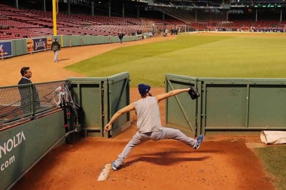 敵地フェンウェイパークのブルペンで投球練習を行ったドジャース・カーショー【写真:Getty Images】