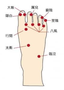 足の親指の爪の生え際、人差し指側にある。肝臓の調子を整える。吐き気に効果あり。