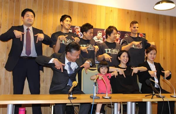 3歳の卓球少女との契約会見で、T.T彩たまの選手たちとポーズをとる坂本監督兼執行役員(左)