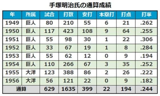 強打の三塁手として1950年に64打点を記録 10月9日、巨人の第19代4番打者だった手塚明治(あきはる)氏が死去した。…
