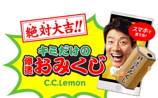 「C.C.レモン “修造おみくじ”付ボトル」は、ラベルに全部大吉のおみくじが記載されている。飲み進めていくことで少しずつボトルの中のおみくじが見え、ラベルをはがして裏を見るとおみくじの全内容を読むことができる。ラベルデザインは全3種、おみくじの内容は全5種。価格は、500mlペットボトルで140円(税抜)。